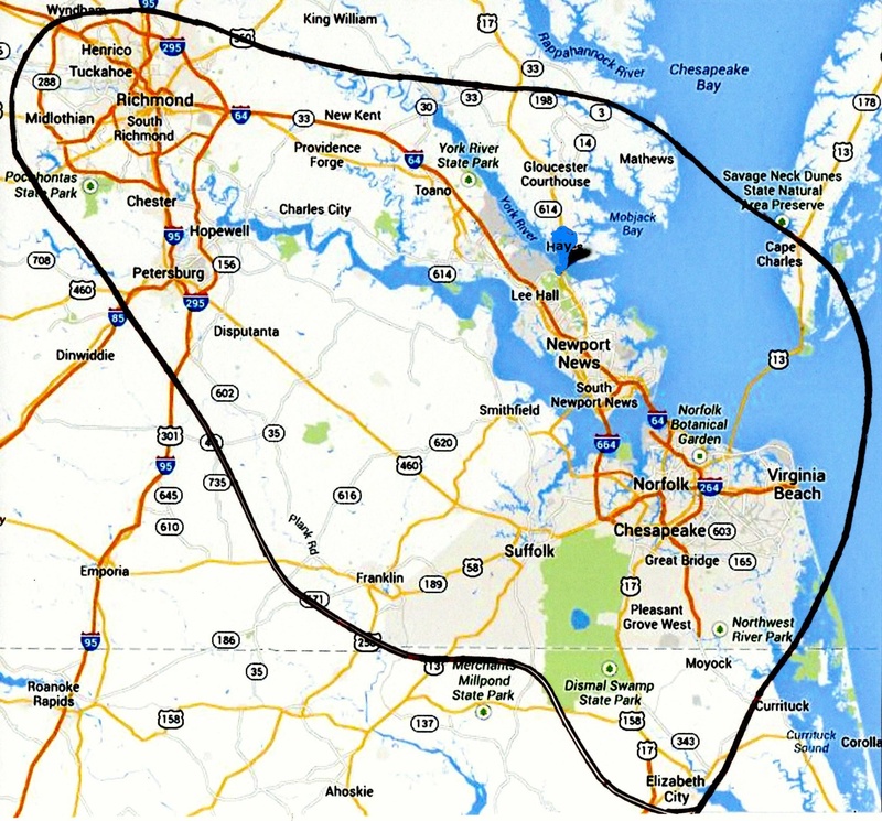 All Areas Within the Black Outline on this Map are Included. For travel to Richmond and Petersburg, please add a $20.00 travel fee. My travel area now includes Elizabeth City!